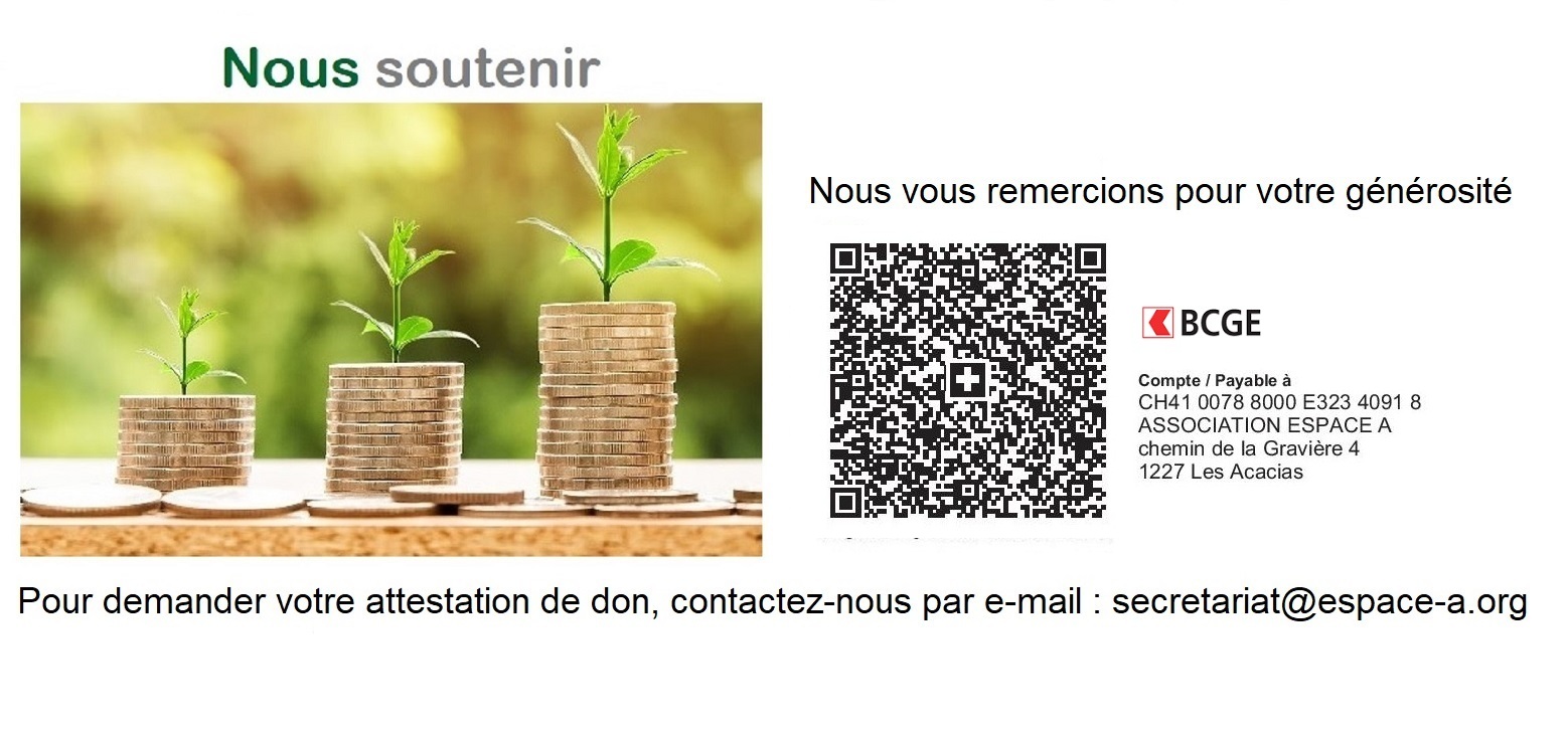Reconnue d’utilité publique, Espace A est une association professionnelle active depuis 25 ans, à Genève, qui veille au respect des droits de l’enfant, de son intérêt supérieur et de l’éthique dans l’adoption, le placement extra-familial, la recherche d’origines et la conception via les techniques de procréation médicalement assistée.
